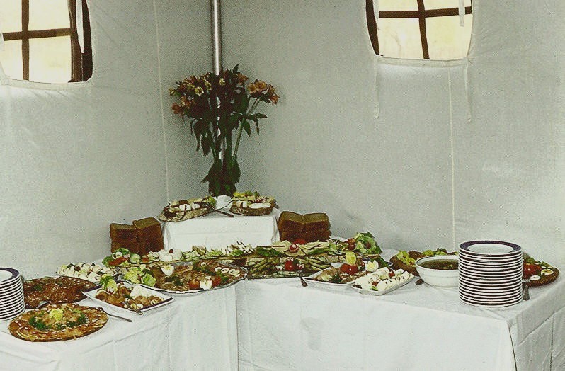 Weil unsere Küchenbesatzung es immer bei solchen Einsätzen so handhabte, gab es meist zum Abendbrot Bratkartoffeln, oder es wurde eine „Salatbar“ aufgebaut. Ist mittags Fleischkomponente übrig geblieben, gab es abends vielleicht Gulaschsuppe., natürlich unter Beachtung hygienischer Vorgaben. Obst war eigentlich den ganzen Tag über im Angebot – unseren Gästen sollte es an nichts fehlen. Die meisten fühlten sich auch bestens versorgt.