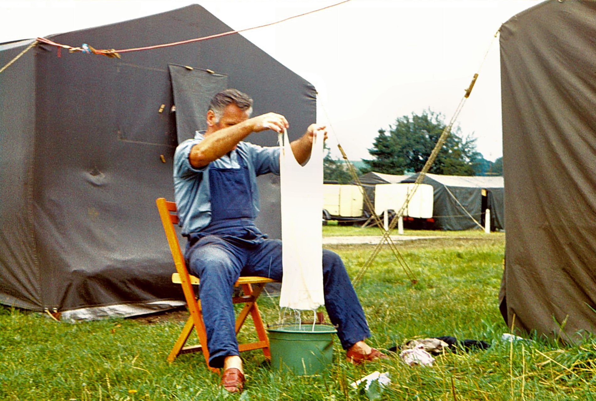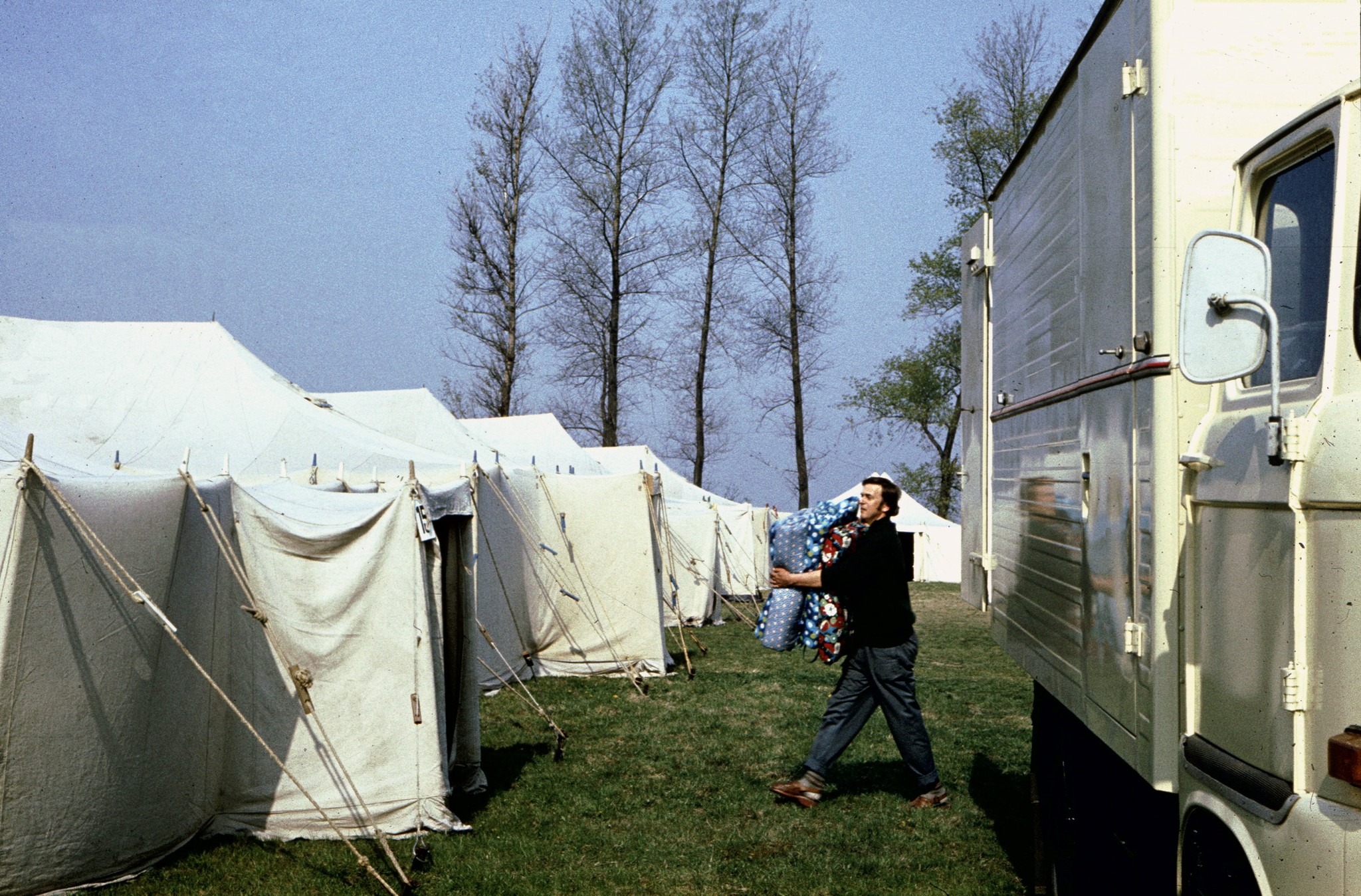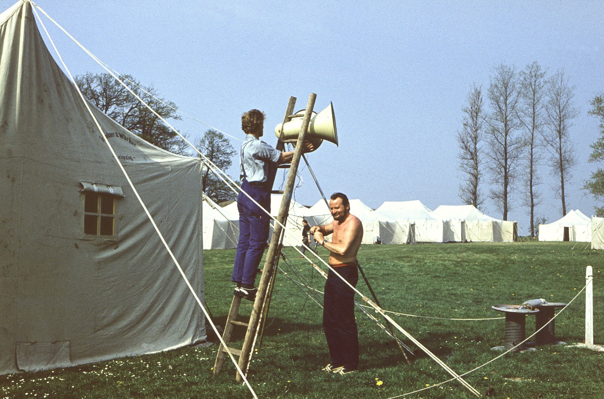 Neben diesen Versorgungsaufgaben hatten wir natürlich auch Betreuungsaufgaben zu erfüllen. Alle Lagerteilnehmer konnten mehrere Stunden am Tag unseren Duschzug nutzen – natürlich schön getrennt. Am Duschwagen gab es ja auf jeder Seite ein Umkleidezelt, hier also ein Zelt für Mädchen, die andere Seite für Jungen und dann auch in einem Zeitrhythmus – jeweils zirka eineinhalb Stunden für die einen, dann für die anderen – ganz wie der Andrang war. Die Ansage dazu kam über den Lagerfunk. Das war das Reich von Heinz, unserem Nachrichtentechniker.