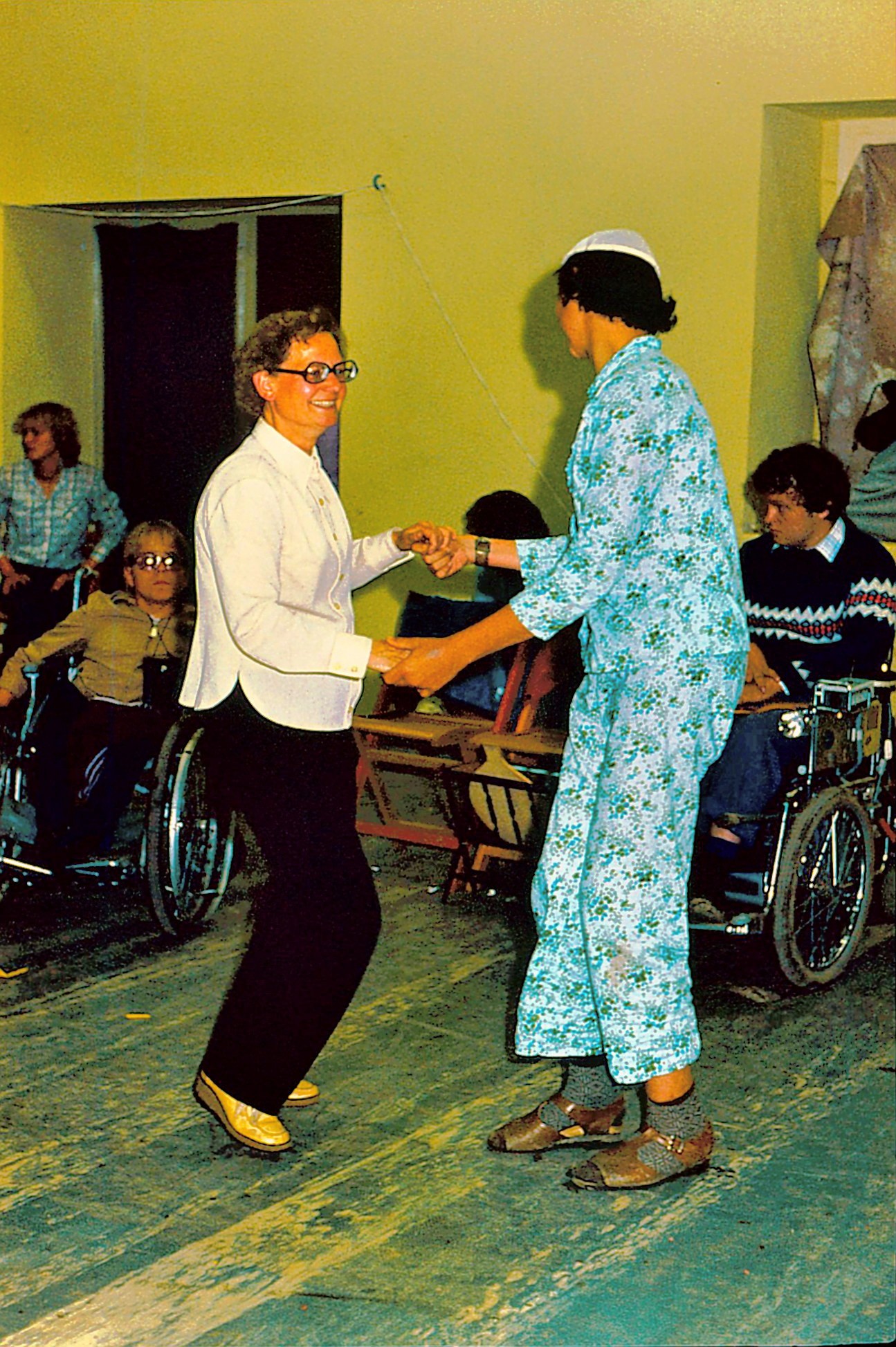 "Ecke" machte mit unserem "Küken" den Eintänzer und es dauerte nicht lange, da war richtig Betrieb auf der Tanzfläche. Keiner hatte Hemmungen, es war ja kein Fremder da, der unsere Rolli-Kinder beobachten könnte und sie legten alle sonst gezeigte Hemmungen ab und freuten sich einfach des Lebens.