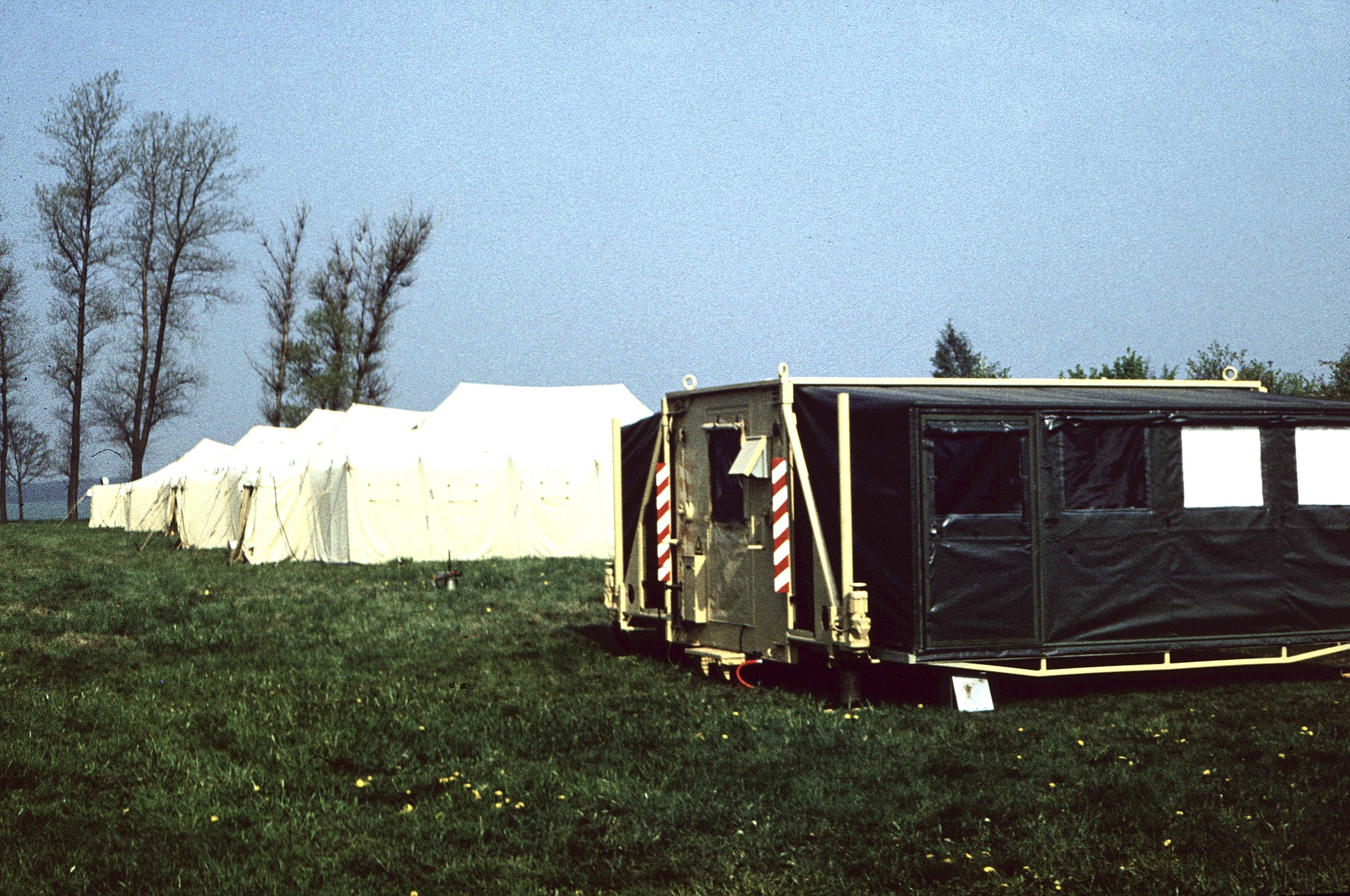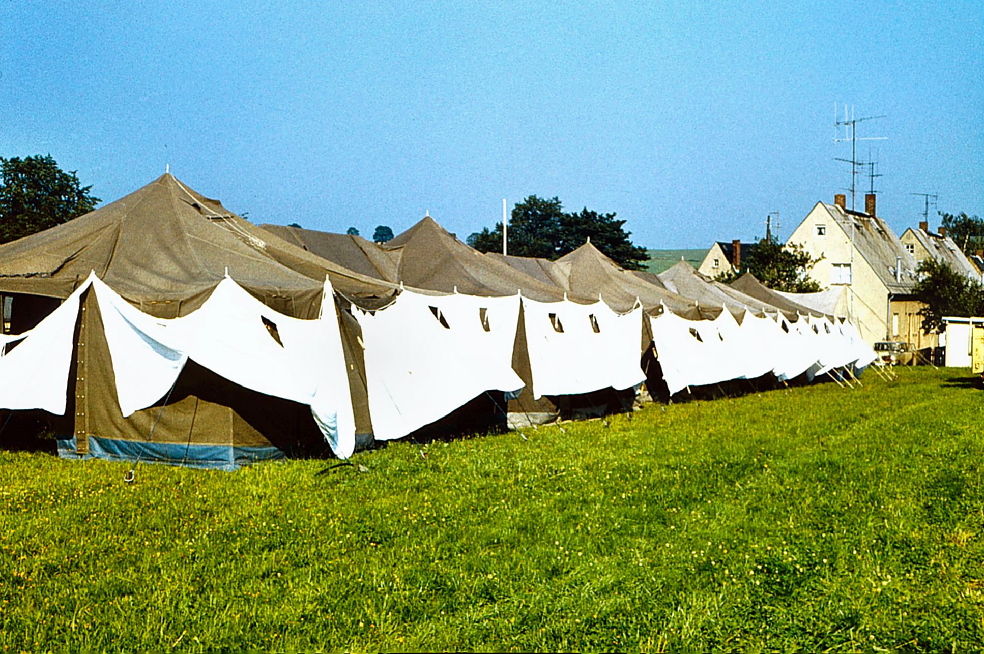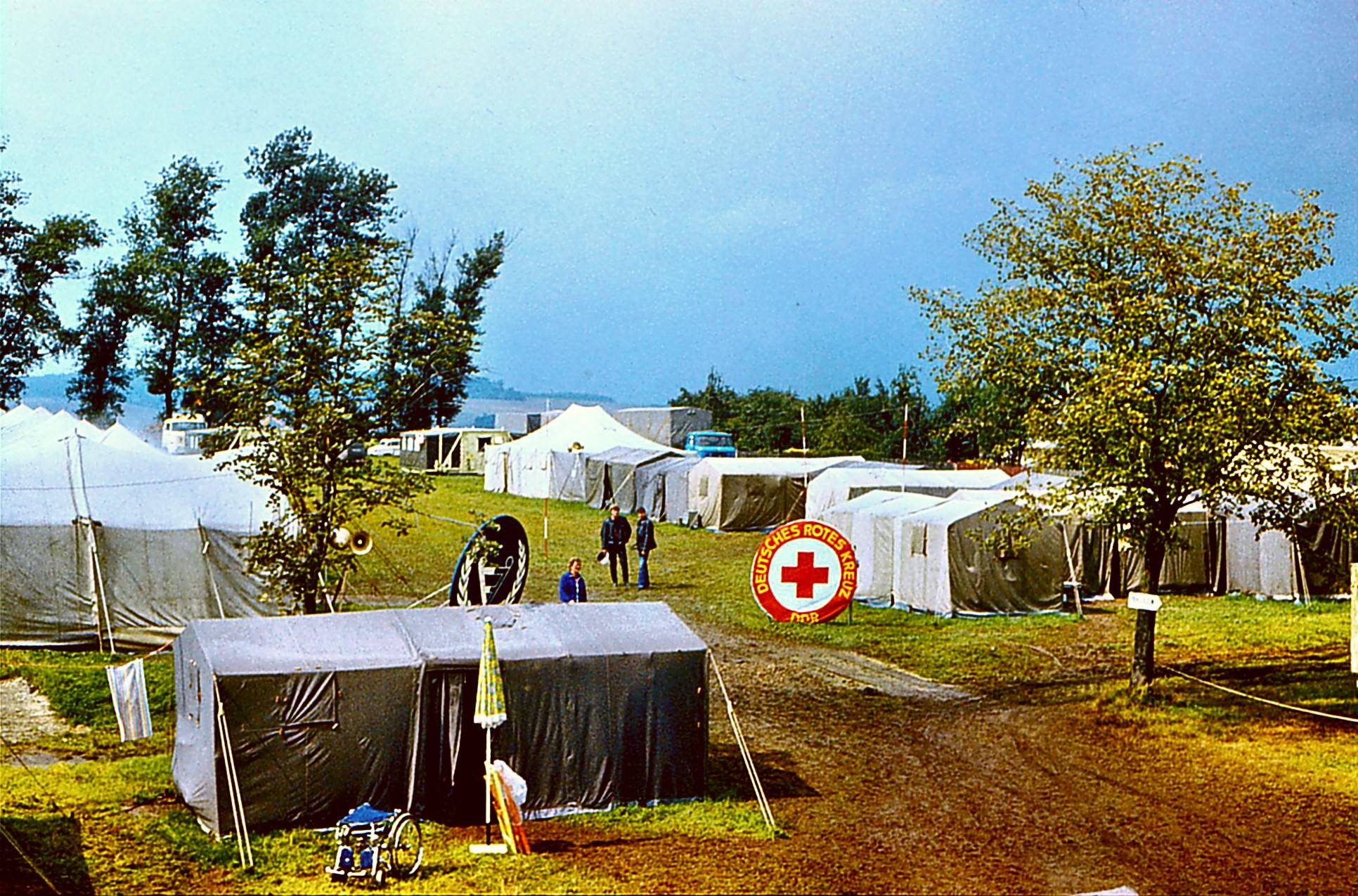 Für uns, die Mitarbeiter des Hilfszuges des DRK, ist so ein Lager zwar eine aufwendige Aufgabe, aber nicht außergewöhnlich. Wir haben solche Aktionen schon oft erlebt und dabei schon eine gewisse Routine erreicht. Aber trotzdem, ein neuer Standort bringt neue Hindernisse, die überwunden werden wollen. Schließlich hat am Eröffnungstag das Zeltlager in einem Zustand zu sein, dass sich unsere Gäste wohl fühlen. Also sind wir Tage vorher mit großem Tross hier eingetroffen. Der Sportplatz der Gemeinde Euba war als Lagerplatz zugewiesen und wir hatten mit den Bedingungen fertig zu werden. Nur gut, dass das Wetter uns wohl gesonnen war. Die Sonne hat uns an allen Tagen verwöhnt, so dass wir in den Zelten keine Heizungen einrichten mussten.
