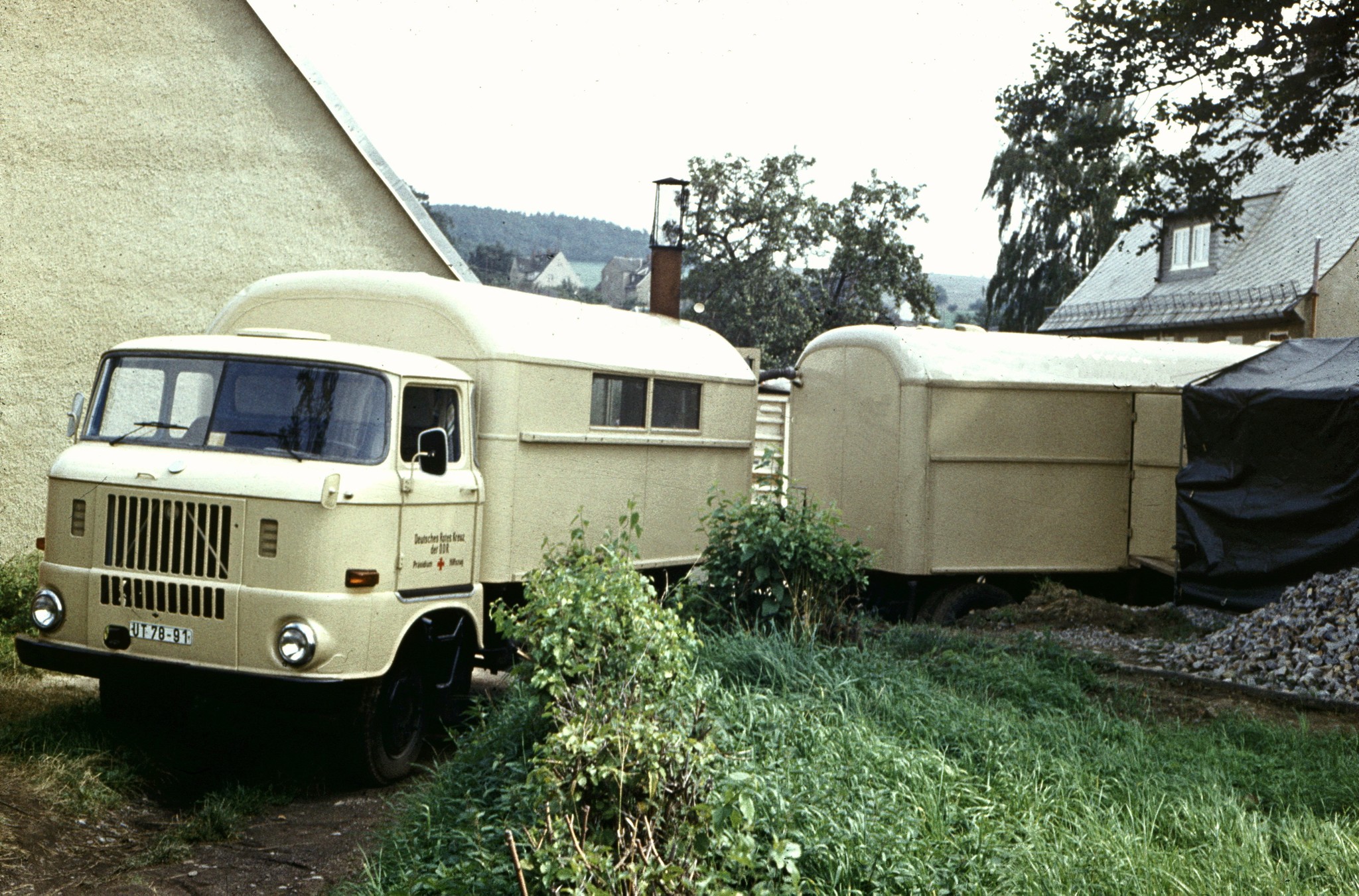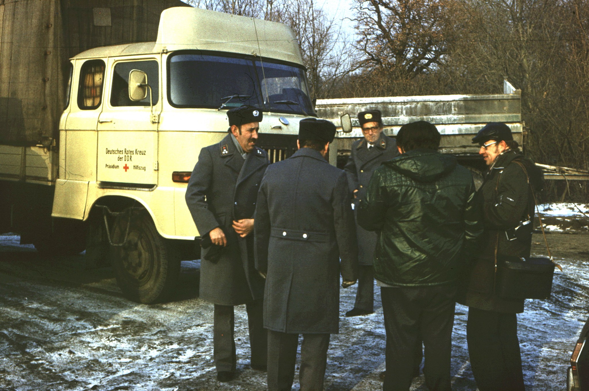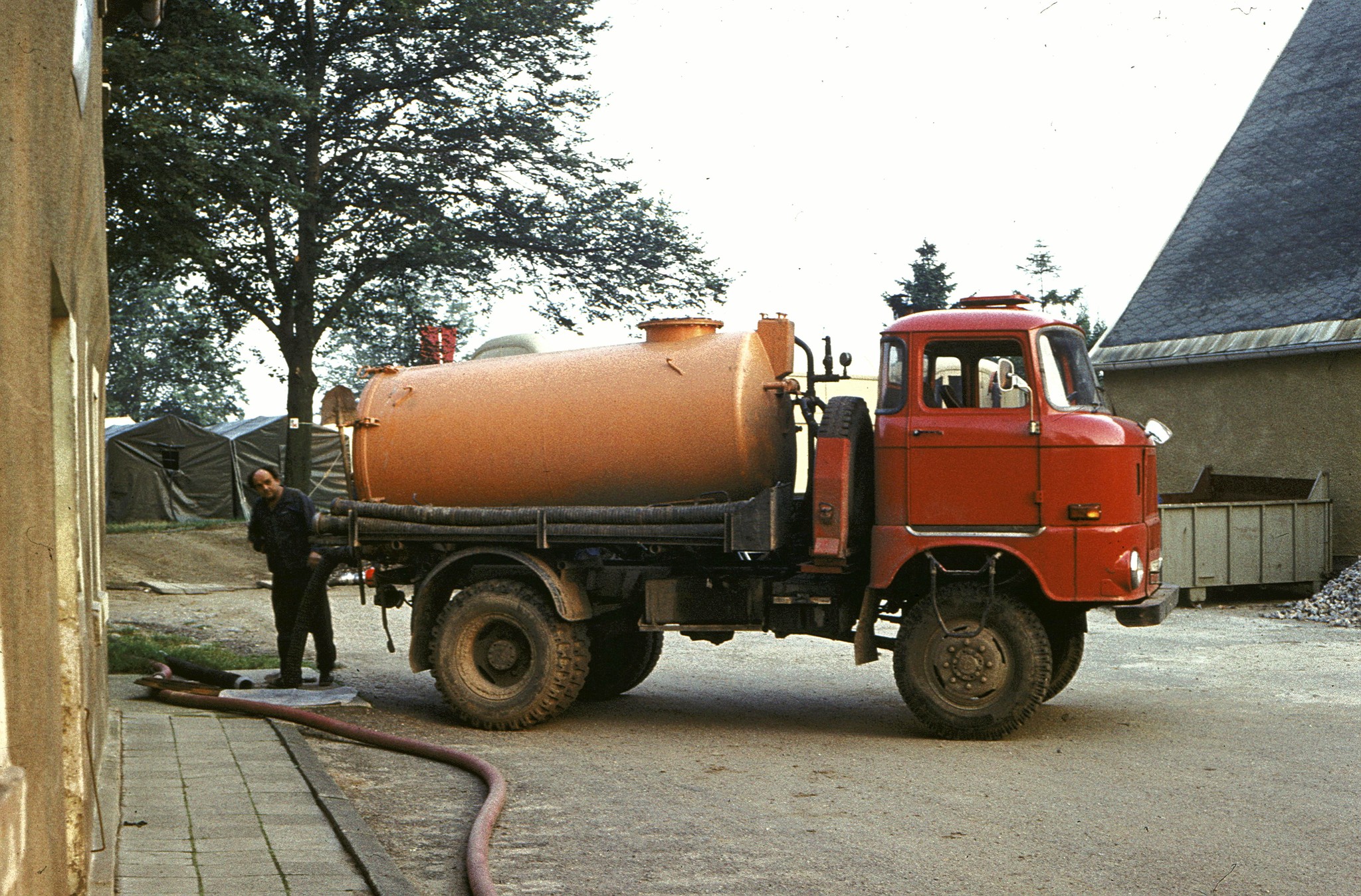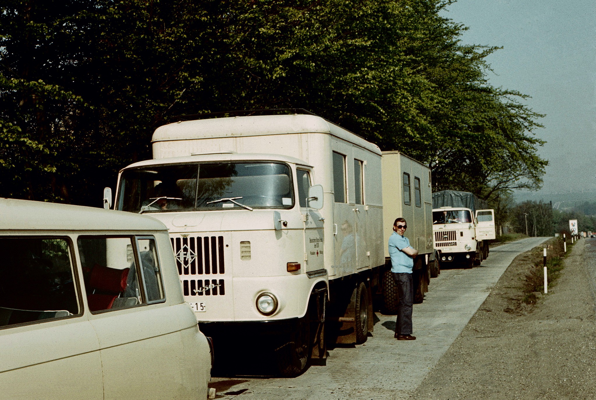 Manfred, mein Techniker der Med.- Gruppe. anfangs hat er unseren OP-Zug gefahren, einen H6 – Spezialkoffer mit Spezialkoffer-Hänger als OP-Einheit und kleinem Wasserhänger. Das war knapp eine Zug-Einheit, die an das Maß „Überlänge“ reichte. Da musste man schon ein guter Kraftfahrer sein, um alle Kurven ohne Schrammen zu schaffen und die Lenkung des H6 hatte noch keine Hydraulikunterstützung. Mit Beginn der Umrüstung der Med.-Technik Anfang der 80er Jahre auf die hochmodernen Faltkoffer, kamen neue Aufgaben auf ihn zu. Die Faltkoffer, etwa in der Größe eines 20-Fuß-Containers, haben eigene Hebe-Einrichtungen und können somit von jedem Transport-LKW befördert werden und selbständig abgesetzt werden. Wir haben aber für jeden Faltkoffer einen zugehörigen W 50 – Pritsche.