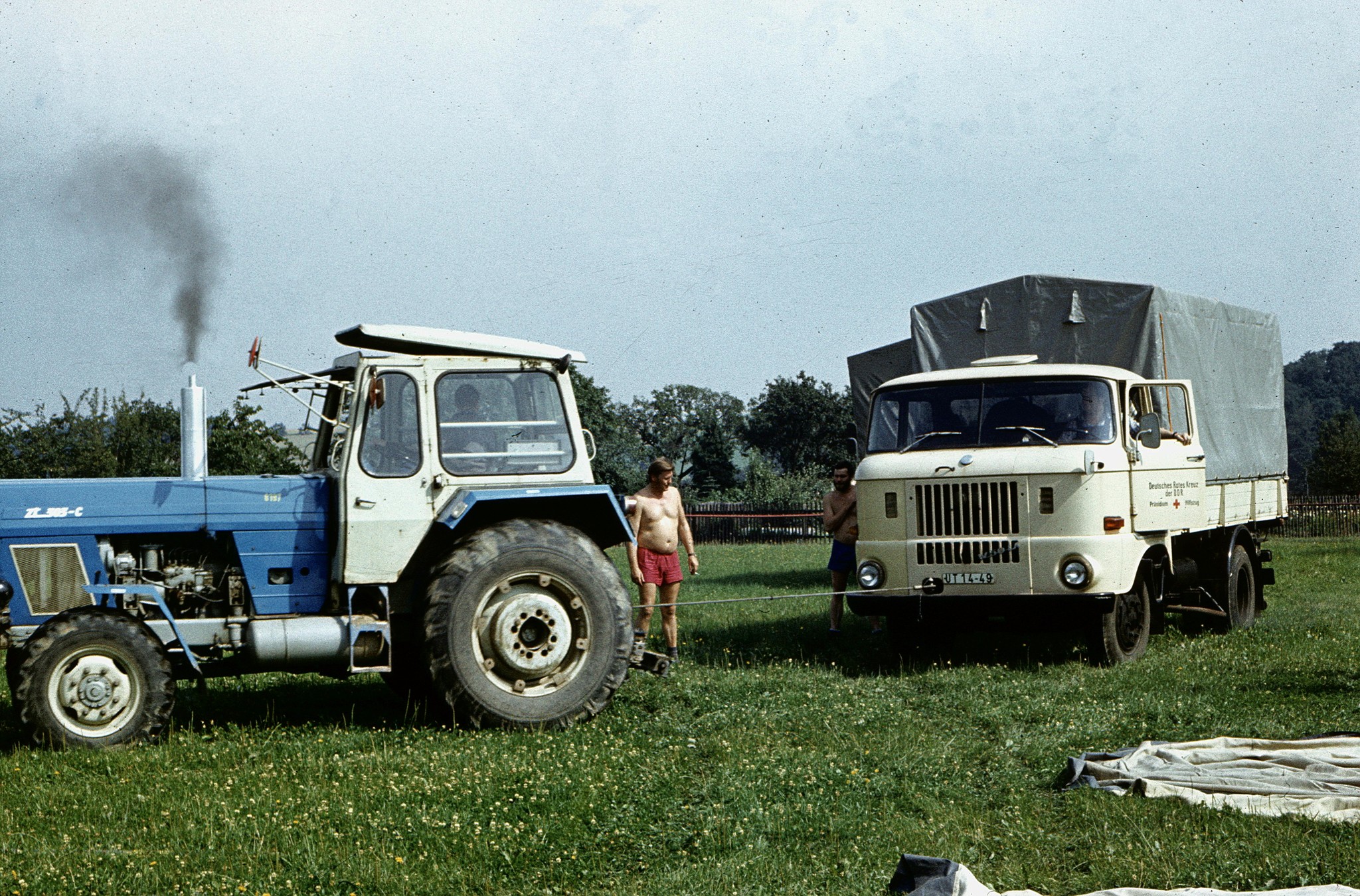 So sehr hob sich diese Funktion aber nicht von den anderen ab, schon gar nicht, wenn wir in der Aufbau- oder Abbauphase waren und alle einen „Blaumann“ anhatten. Während der Lagerzeit auch nur, weil an meinem Ärmel der Dienstkleidung ein paar Streifen, oder auf den Schulterklappen ein paar Sterne sind. Bei unserer Truppe war jeder ein Kraftfahrer, wenn es darum ging die Technik zu warten oder zu bewegen. Schließlich hatten wir über 100 Fahrzeugeinheiten, waren aber nur 25 Mitarbeiter, die hauptamtlich beim Hilfszug beschäftigt waren, einschließlich der Leitung und unserer kleinen Bürobesatzung, bestehend aus Buchhalterin und Bürokraft. Der Leitung des Hilfszuges steht der Leiter der Dienststelle vor. Dann gab es drei Gruppenleiter - den Gruppenleiter Technik, verantwortlich für den technischen Zustand der Fahrzeuge, den Gruppenleiter Unterkunft, verantwortlich für alles Material, was zur Betreuung notwendig ist und den Gruppenleiter Med.- Versorgung, der zugleich Stellvertreter des Leiters der Dienststelle war, aber hauptsächlich verantwortlich für die umfangreiche medizinische Ausrüstung. Denn der Hilfszug des Präsidiums der DRK der DDR hatte ja als Hauptaufgabe, die ständige Einsatzbereitschaft der umfangreichen speziellen technischen Mittel der Organisation zur Sicherstellung der Versorgungs- und Betreuungsaufgaben bei schweren Havarien oder Katastrophen zu gewährleisten. Das sind Ausrüstungen und Fahrzeuge, um im Einsatzfall für bis zu 1000 Bedürftigen erste medizinische Hilfe, Versorgung und Betreuung leisten zu können. Um diese Mittel aber nutzen zu können, ist eine Vielzahl von zusätzlichen Helfern erforderlich, die mit dieser Technik vertraut und bereit sind, im Bedarfsfall sofort und ohne „Wenn und Aber“ zur Verfügung zu stehen. Einfach Menschen, denen "Helfen" eine Selbstverständlichkeit ist, die bereit sind, Tag und Nacht für diese Aufgabe einzustehen, und das meist auf freiwilliger Basis. Die oft ihren Urlaub dafür opfern, um mit uns zu Einsätzen zu fahren. Einfach für Andere da zu sein. Diese Einsatzbereitschaft zur Hilfeleistung gilt für fast alle Kameradinnen und Kameraden, die ich in den Jahren meiner Tätigkeit beim Hilfszug kennen gelernt habe. Und so eine Einstellung zur Sache formt ganz selbstverständlich ein Kollektiv, das gemeinsam durch dick und dünn geht. Das gilt nicht nur für unsere hauptamtlichen Mitarbeiter, auch für die ehrenamtlichen Kameradinnen und Kameraden. Jeder von uns hatte dafür Sorge zu tragen, dass die ihm anvertraute Technik einsatzbereit ist, die Fahrzeuge gepflegt werden – und da hatte jeder hauptamtliche Mitarbeiter mindestens drei bis vier Fahrzeuge zu warten, musste auch die entsprechende Technik beherrschen und zugleich ein Allrounder sein, denn Vielseitigkeit war gefordert, um allen Aufgaben gerecht werden zu können.