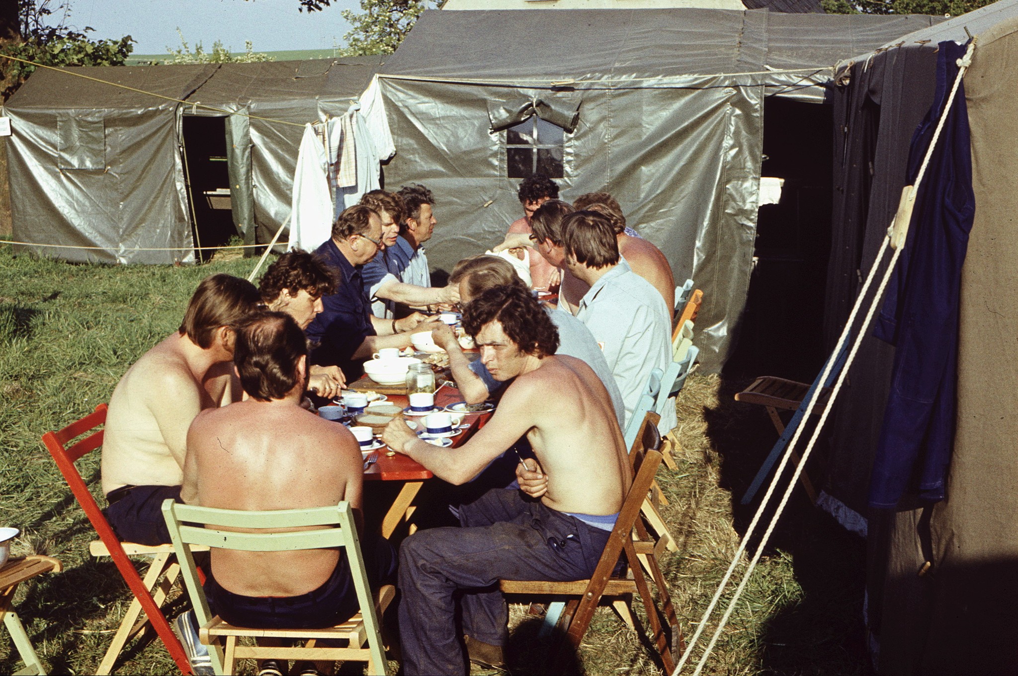 Kamerad Dr. Hagemoser rettete die Situation, indem er nach der ersten Zigarette vorschlug, ob man nicht doch bei diesem herrlichen Sommerabend besser draußen weiter diskutieren sollte, im Zelt wurde langsam die Luft doch ganz schön „dick“. Also zog man raus an die im Grünen zwischenzeitlich vorbereitete Tafel.