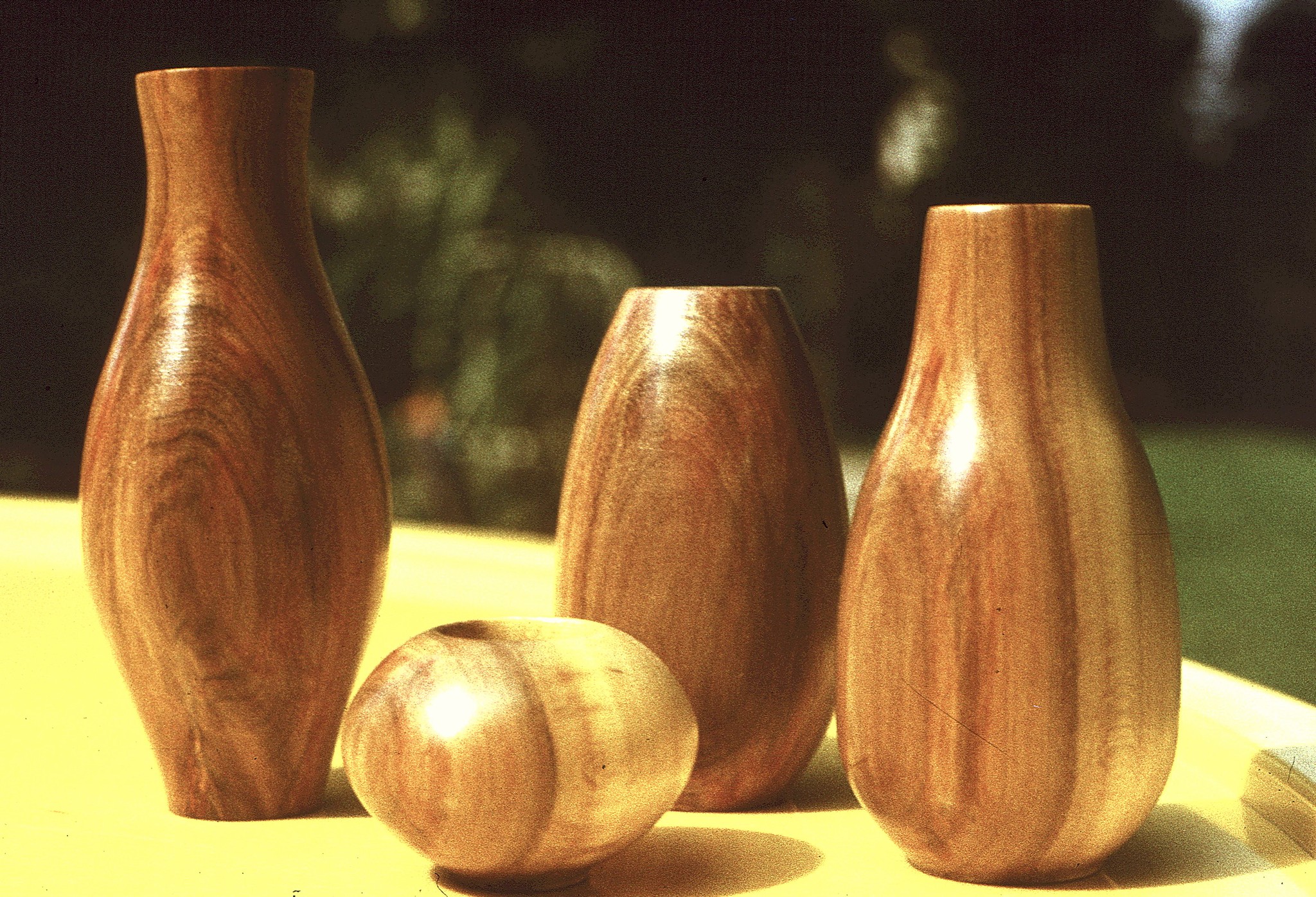 Diese, den Amphoren nachempfundenen, wunderschönen Arbeiten, erhalten durch die Auswahl des Obstgehölzes eine ganz besondere Zeichnung der Holzmaserung, dafür muss man ein Auge bereits bei der Holzauswahl haben, um dann diese kleinen Kunstwerke herstellen zu können, wobei die größte dieser Holzvasen nicht mehr als 7 bis 8 cm hoch ist, die kleinste vielleicht 2 bis 2,5 cm. Eine ganz besondere Oberflächenbehandlung, kein Farblack, sondern naturell behandelt mit einer selbst entwickelten Wachsmischung, einfach wunderbar!